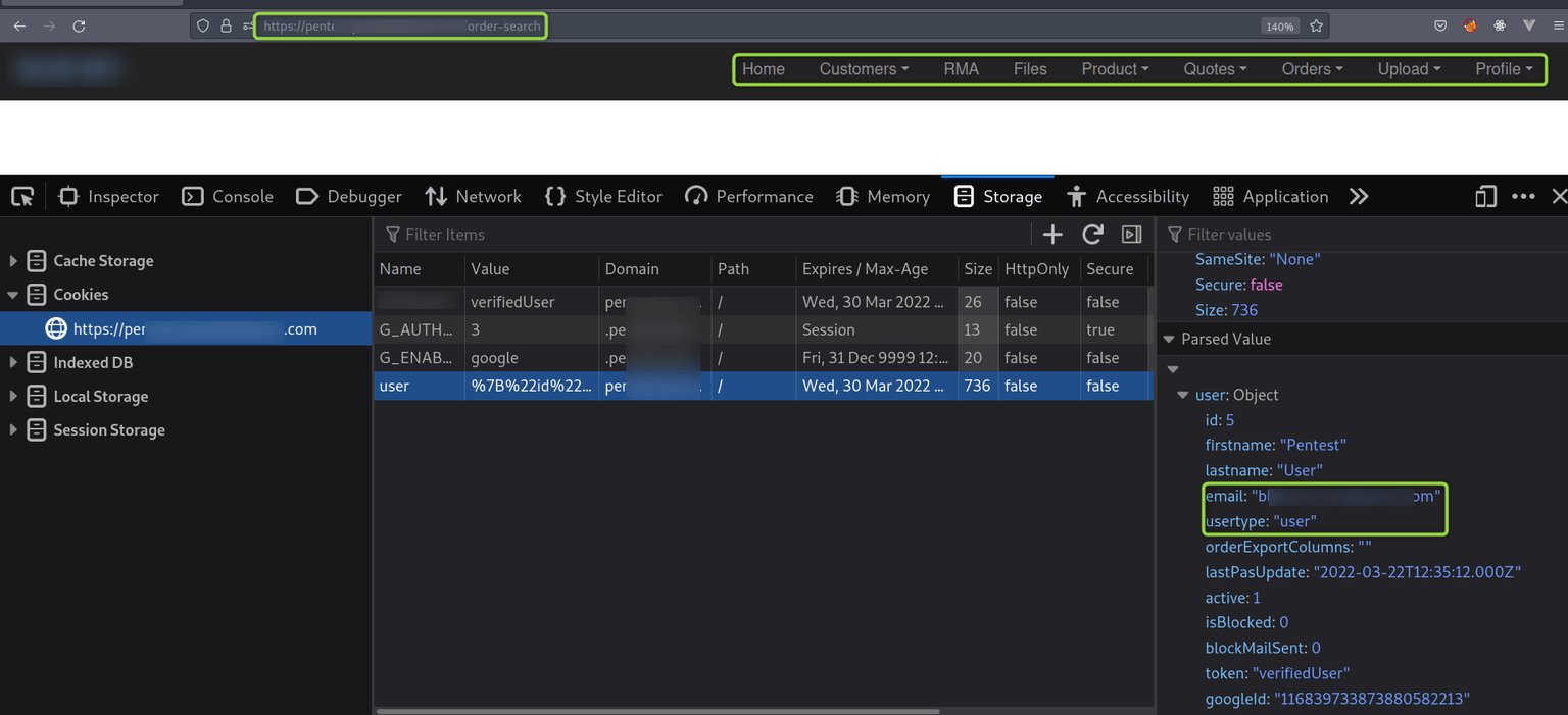 In this use case, the web application supports 2 user roles: admin and user. The session cookies are URL encoded and they have a JSON structure where you can see the usertype parameter either set to “user” (for regular users) or set to “admin” (for administrator accounts).
