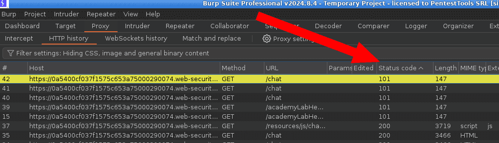 To do this, look for the HTTP Status 101 “Switching Protocol” HTTP Status in the Proxy > HTTP History tabs.
